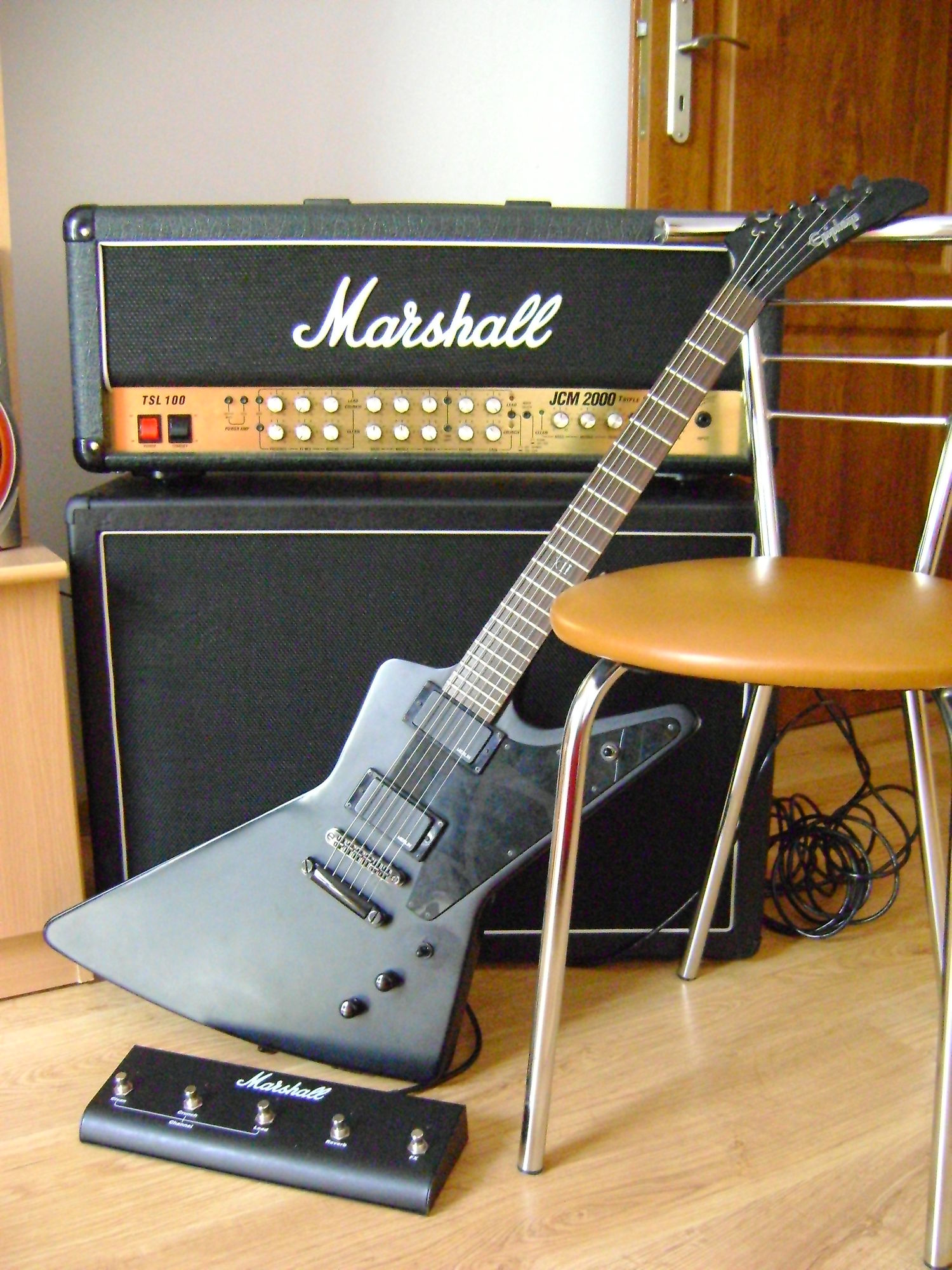 NGD Harley Benton G212 Vintage Na zdjęciu: Epiphone Explorer Goth z Merlinami Eclipse, Marshall JCM 2000, a dokładniej TSL 100, Harley Benton G212 Vintage, kolumienka z thommana na V30.