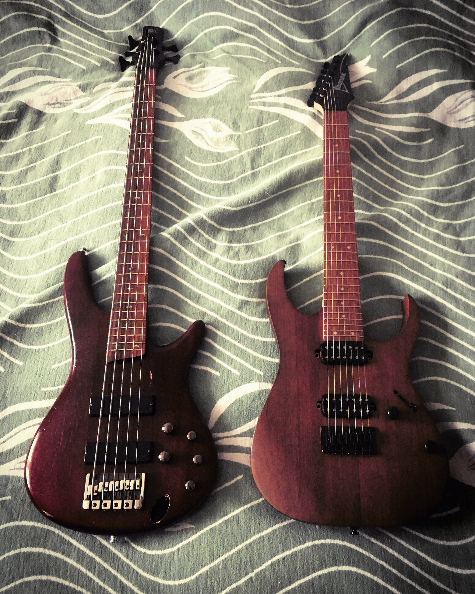 Cześć, tu Łukasz. Pochodzę z Katowic i od dobrych kilkunastu lat gram na basie. Zwykła gitara przewijała się w tle od długiego czasu i tak od 3 dni jestem szczęśliwym posiadaczem Ibaneza RG7421WNF ;). Nie znam się na gitarach a tym bardziej „siódemkach”, ale w/w sprzęt spełnia wszelkie wymagania jakie mam, no i idealnie nadaje się do preferowanych przeze mnie klimatów muzycznych. A oto moje dziewczynki: