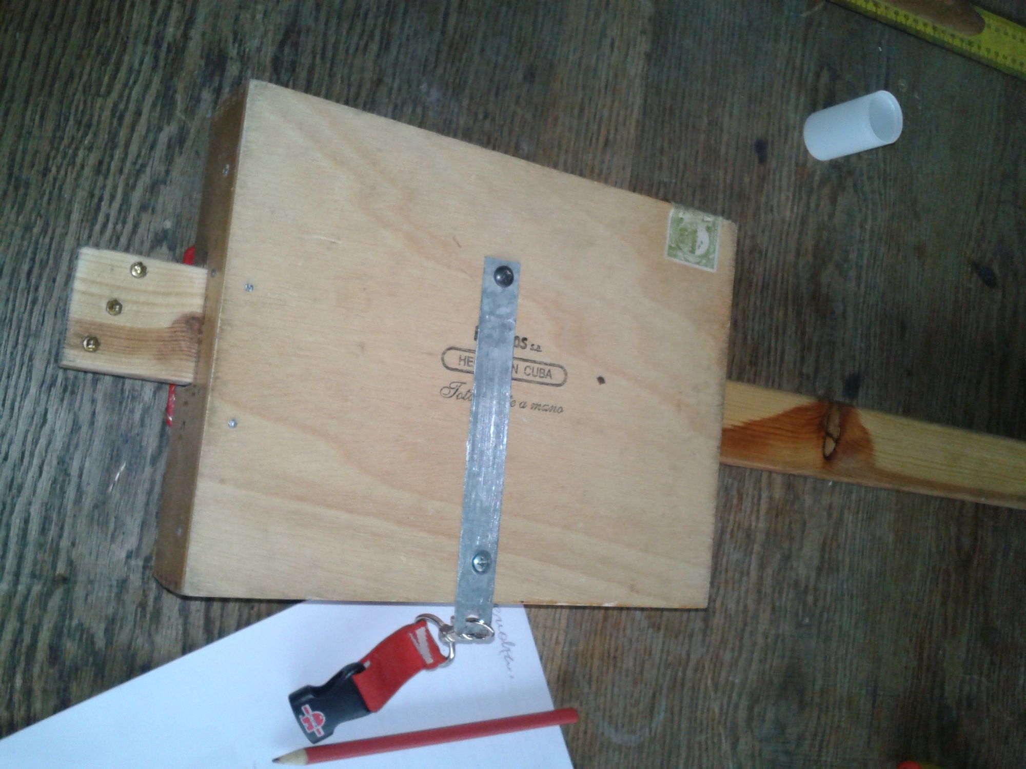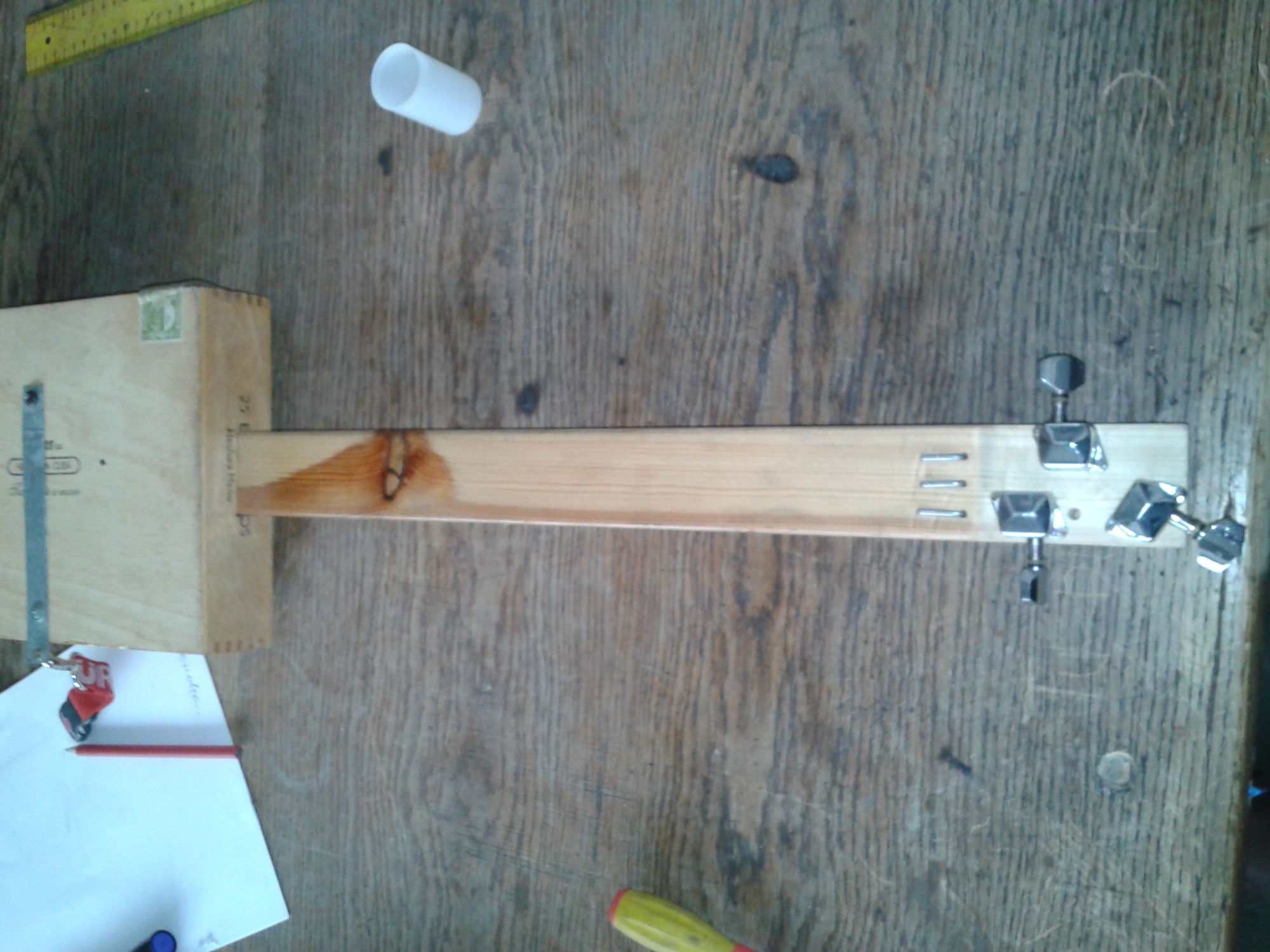 Inspiracją było pudło cygar od wujka z Wenezueli. Przeglądałem trochę stron o takich konstrukcjach i wziąłem się za swoją robotę. Zdecydowałem się na 3-strunowego fretlessa do grania slajdem (chyba bardziej z lenistwa niż z upodobań).