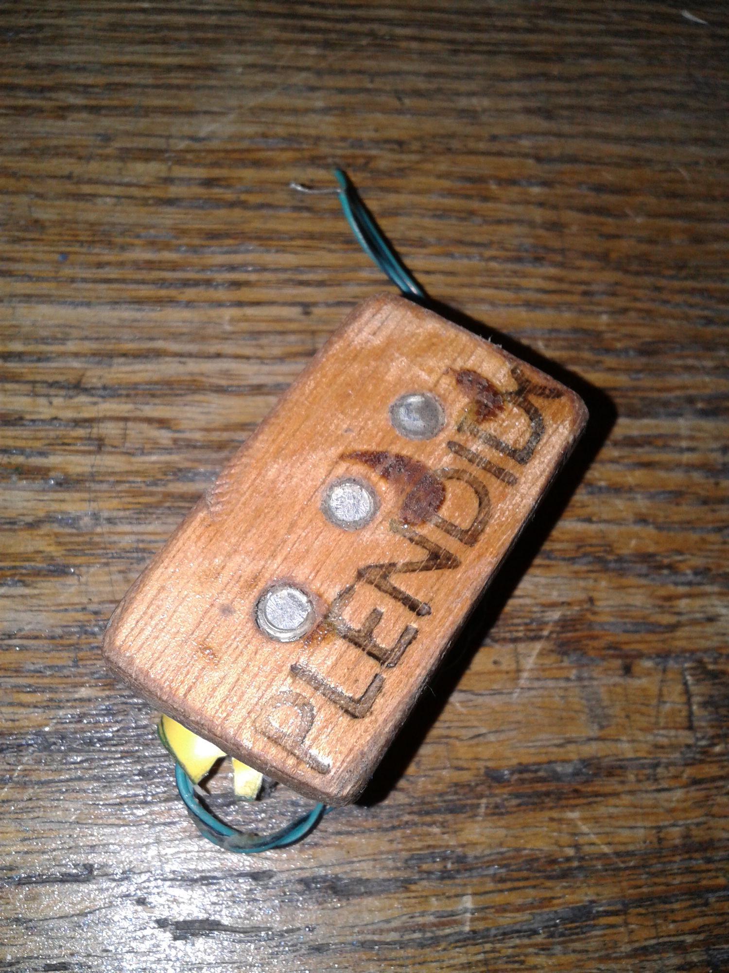 Następnie pomyślałem o zelektryfikowaniu grata, ale postanowiłem, że pickup też będzie DIY. Miałem jakiegoś starego pickupa do siódemki, którego "rozbroiłem" i wyjąłem magnes. W kawałku drewienka wywierciłem 3 otwory, w które wsadziłem śrubki, do których przykleiłem magnes, po czym całość owinąłem drutem nawojowym. Dolutowałem kabelki do podłączenia gniazda, zabezpieczyłem izolacją i całość wsadziłem do wosku. Oczyściłem drewno z wosku zapalniczką, przez co pickup zyskał nieco "vintage look". ;)